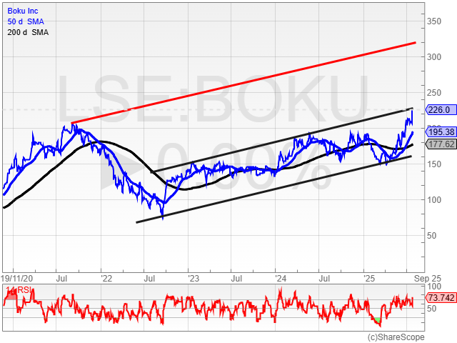 A month on, the shares have rise from 195p to 226p, a decent gain of 16%, despite no M&A news at all. Instead, we have had the latest Trading update for the six months ended 30 June 2025. Entitled “Empowering merchant growth through our global LPM network and strategic execution” it was certainly a positive affair. Adjusted EBITDA is anticipated to be at least $21 million, up c.50% on the prior comparative period (H1 2024: $14.2 million), reflecting an adjusted EBITDA margin of c.33% (H1 2024: 30.1%). Boku‘s own cash grew by 16% to c.$87 million at 30 June 2025, up from $75.2 million at 30 June 2024 and $80.2 million at 31 December 2024. This includes the impact of the repurchase of 5.8 million Boku shares during H1 2025 at a cost of $12.3 million. Previous guidance in relation to organic revenue growth exceeding 20% on a compound annual growth rate (CAGR) basis over the medium term and achieving adjusted EBITDA margins in excess of 30% remain unchanged.